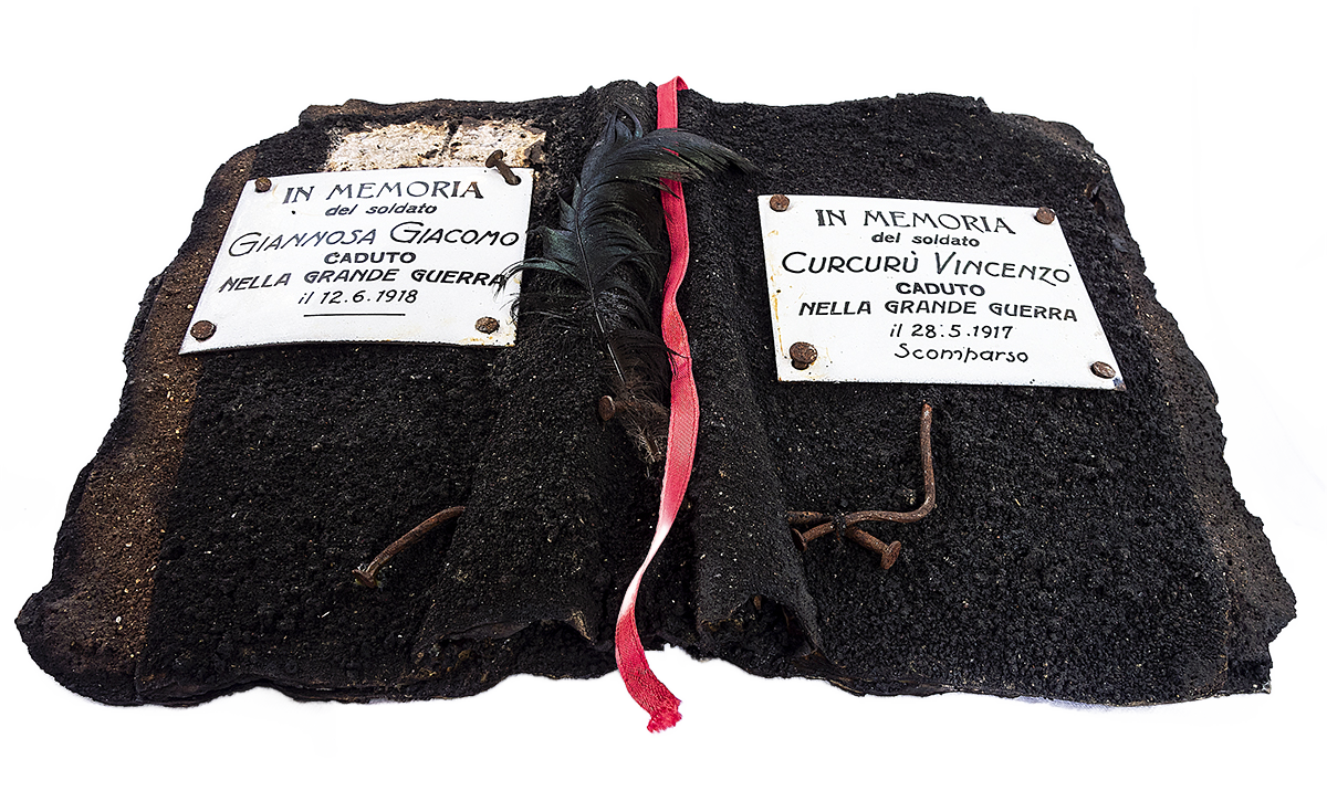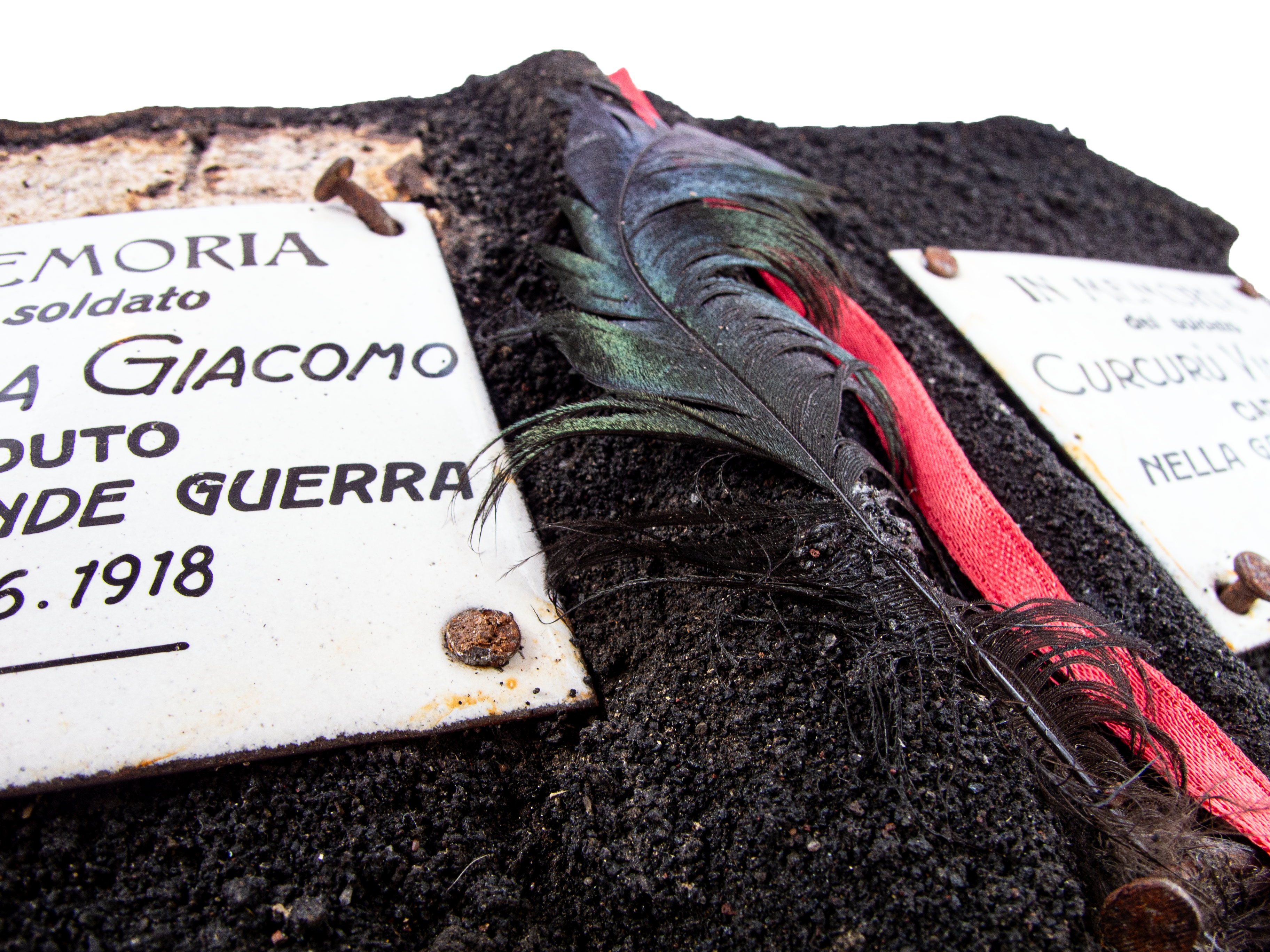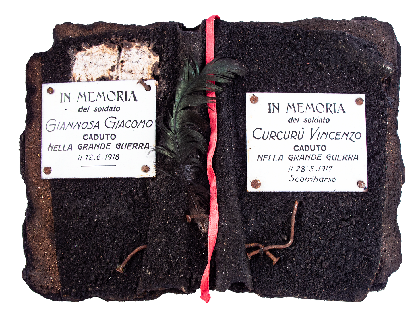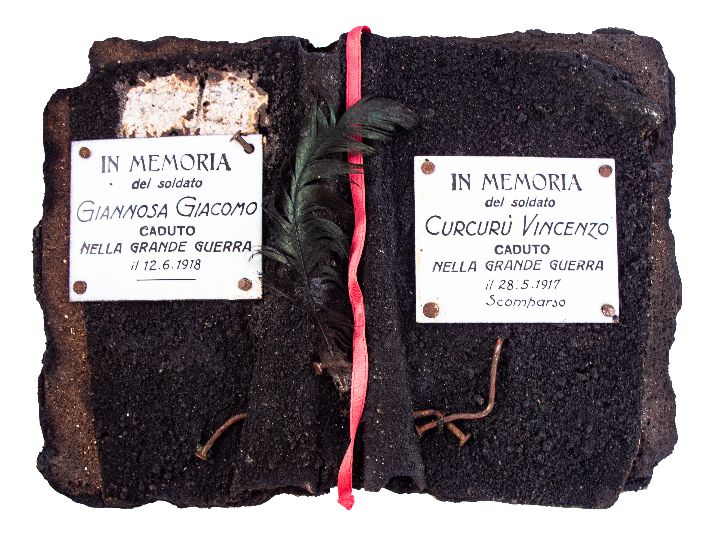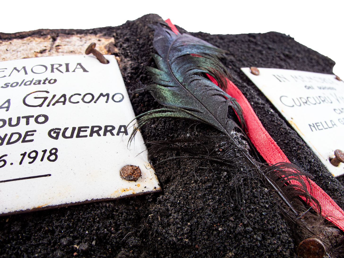 La consistenza visiva è dominata dal nero della terra bruciata, che avvolge e quasi inghiotte la pagina. Le due targhe in ceramica, fissate con chiodi arrugginiti, riportano nomi, date e circostanze di morte di due soldati della Prima Guerra Mondiale. Il segnalibro rosso, ormai tratto ricorrente, attraversa il centro della pagina mentre una piuma scura si sovrappone, elemento di estrema fragilità che evoca la caducità della vita e, allo stesso tempo, la leggerezza della memoria.